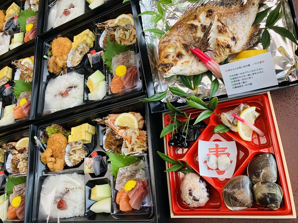 大人のお料理 ¥3,300円~のテイクアウトのオプションとして 御利用いただけます!お食い初め膳 ¥1,210円 鯛尾頭付き塩焼 ¥2,500円~ ¥3,000前後(入荷の鯛の大きさによります)